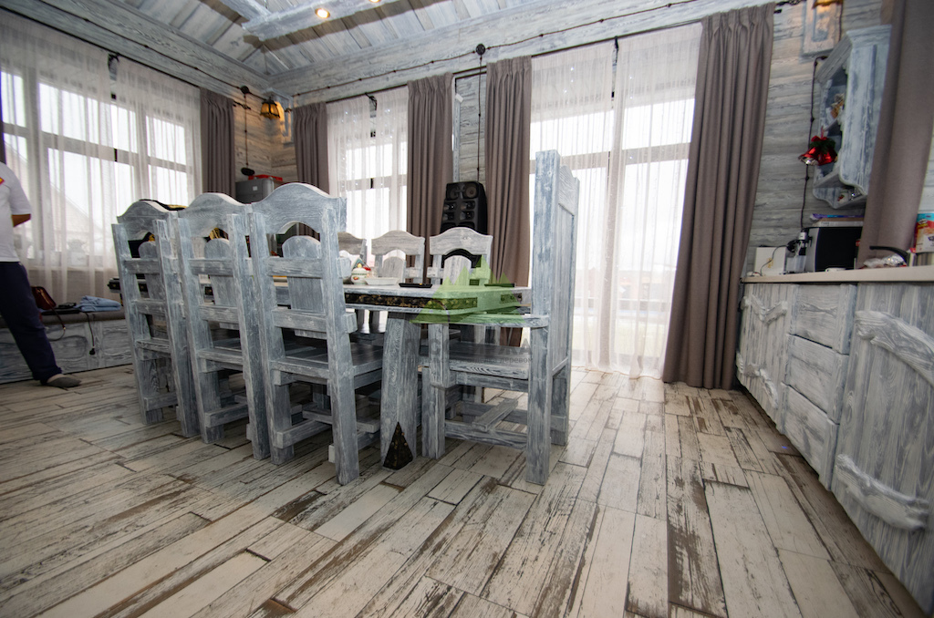 Использование светлой и темной эмали в сочетании с мастерством наших колористов позволяет нам достигать желаемых винтажных оттенков, имитируя естественное старение дерева. Дерево, обработанное таким образом, всегда выглядит изысканно и благородно, оно прекрасно "уживается" с керамикой, кирпичом и камнем, дополняя друг друга и создавая цельный, гармоничный ансамбль, как это и было реализовано при отделке комнаты отдыха.