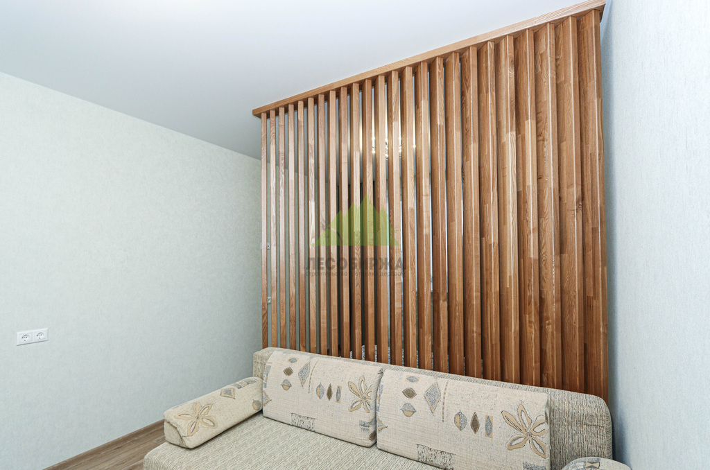 - Подходят для легкого зонирования собственными силами. Хотя для идеального результата мы рекомендуем обращаться к профессионалам Лесобиржи-Спб, сама концепция реечных перегородок позволяет при определенной сноровке и желании внести изменения в интерьер. Однако тонкости, такие как идеальный угол в 45 градусов, как в нашем проекте в Малом Верево, лучше доверить экспертам.