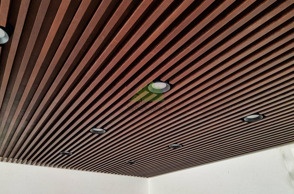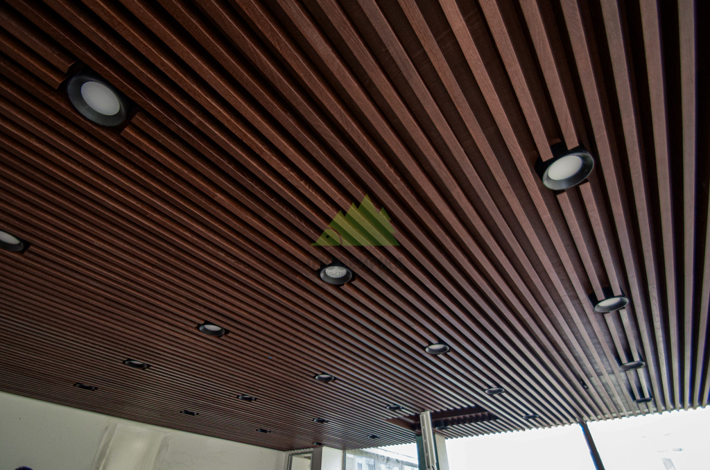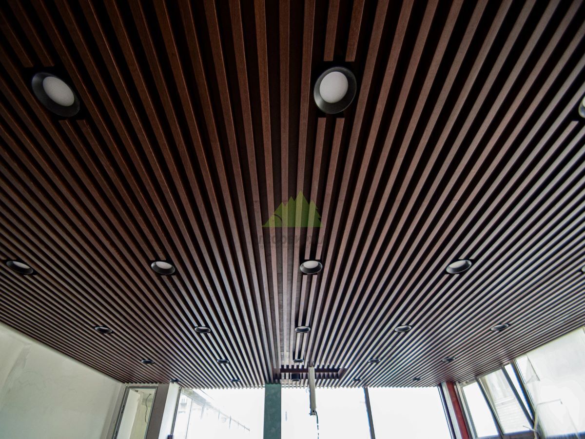 Кульминацией проекта стало изготовление и монтаж самих баффелей. Для их производства мы выбрали МДФ, шпонированный натуральным дубом – материалом, который сочетает в себе стабильность и доступность МДФ с благородством и уникальной текстурой дуба. Производство баффелей осуществлялось на нашем собственном современном оборудовании, что позволило достичь исключительной точности размеров и идеальной обработки каждого элемента. Шпон дуба был тщательно отобран, чтобы обеспечить равномерность рисунка и цветового оттенка, придавая потолку ощущение роскоши и естественной красоты. Финишная обработка баффелей производилась на производстве с использованием состава Magma. Этот высококачественный состав придал поверхности баффелей глубокий матовый или полуглянцевый блеск (в зависимости от согласованного с клиентом варианта), повысил их износостойкость и защитил от внешних воздействий, таких как ультрафиолет и механические повреждения. Преимущества производственной окраски с использованием Magma очевидны: это не только безупречный внешний вид, но и долговечность, устойчивость к выцветанию и простота в уходе. Такой подход позволил создать баффели, которые не только выглядят эффектно, но и прослужат долгие годы, сохраняя свой первоначальный вид.