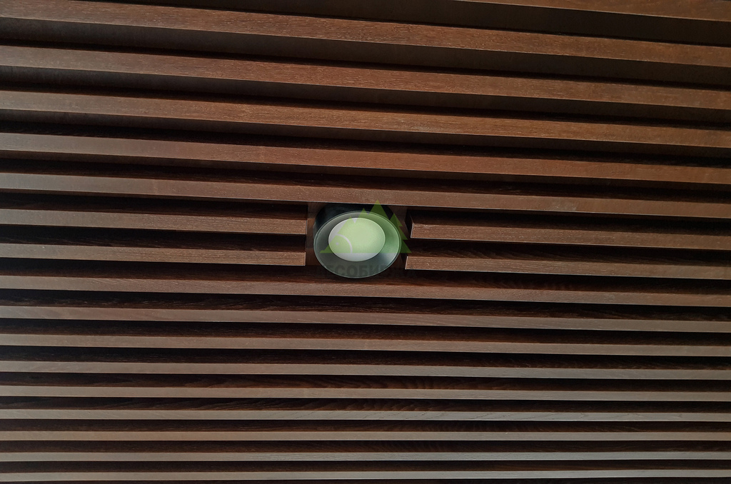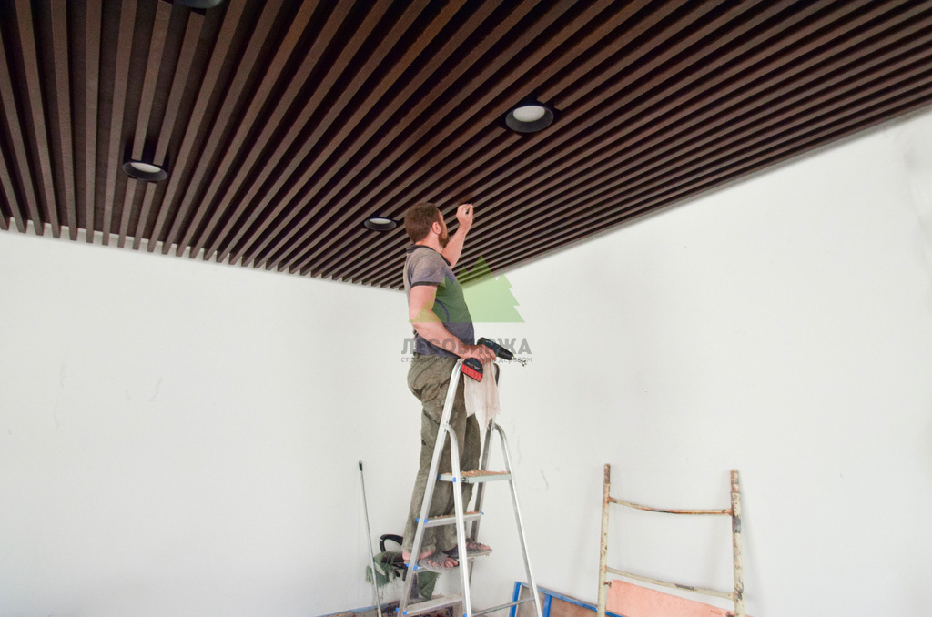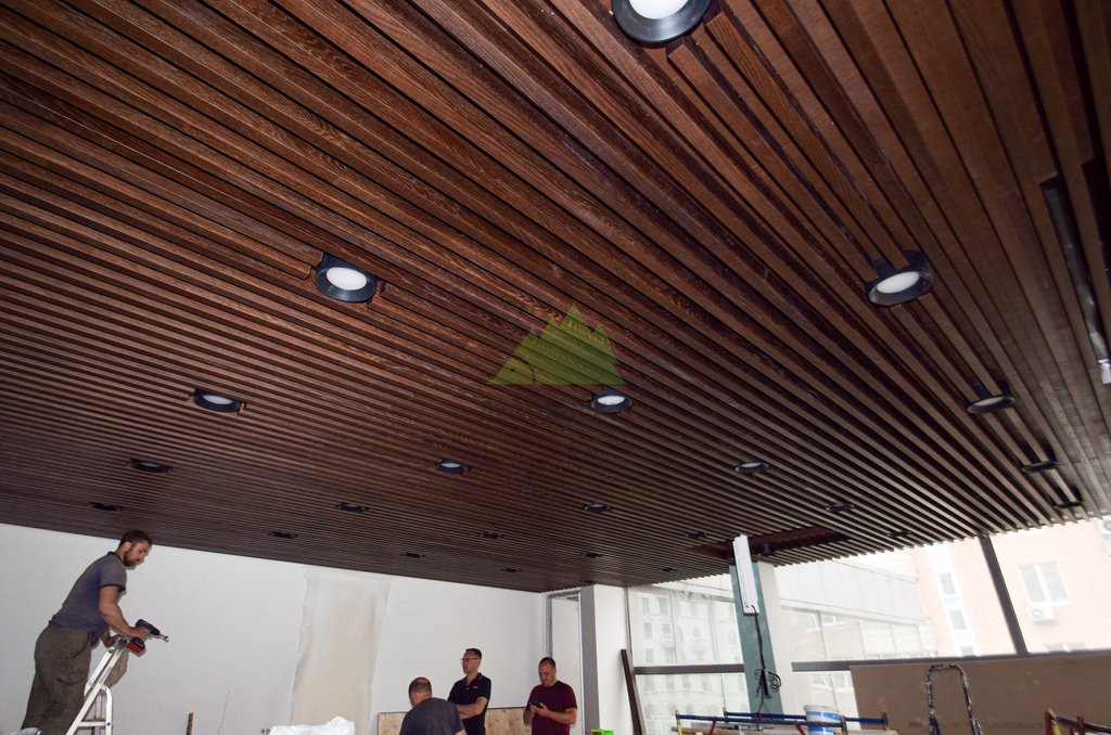 Следующим шагом стало обустройство основания для потолка. Для этого была использована высококачественная фанера, прошедшая специальную обработку и окрашенная на производстве по лаковой схеме ТМ-1515. Выбор производственной окраски не случаен: она обеспечивает идеально равномерное покрытие, высокую стойкость к истиранию и воздействию влаги, а также глубокий, насыщенный цвет, который невозможно добиться при ручной покраске на объекте. Эта фанера служила не только прочным основанием, но и важным элементом акустической системы и эстетики, создавая контраст или гармонию с будущими баффелями. Наши мастера обеспечили безупречную установку каждого листа, минимизируя стыки и создавая монолитную поверхность. Это требовало не только опыта, но и аккуратности, ведь качество этого слоя напрямую влияет на восприятие готового потолка.