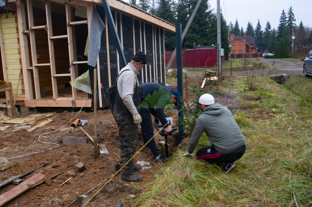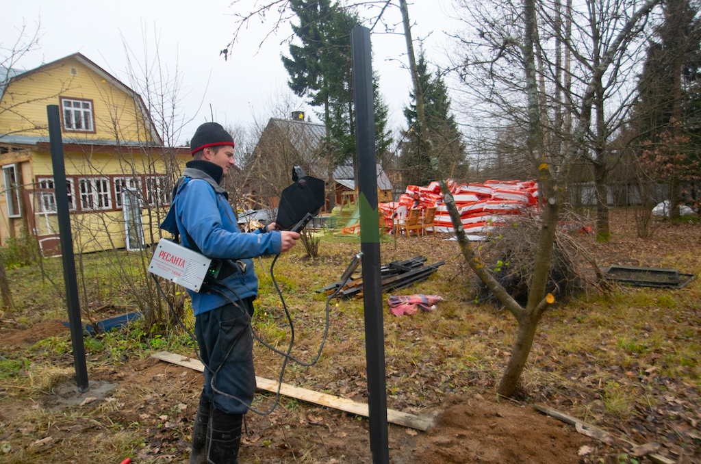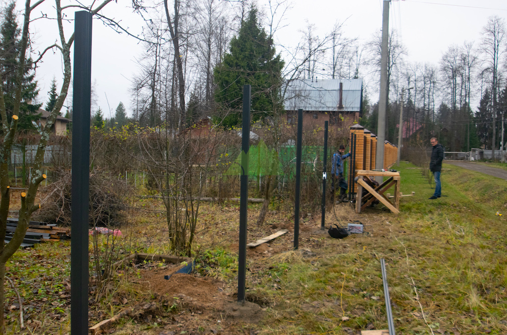 Начали мы с закладки надежного фундамента. Используя бензобур со шнеком 180 мм, наши мастера пробурили скважины для установки профильных металлических столбов. Каждый столб был углублен на 80 см, а затем дополнительно вбит в грунт еще на полметра. Такая глубина залегания и техника монтажа обеспечивают исключительную устойчивость и прочность всей конструкции, что особенно важно для ограждений большой площади и значительной высоты, подверженных ветровым нагрузкам, характерным для нашего региона. После точного выравнивания и установки всех опор, скважины были тщательно залиты бетонным раствором, который после полного затвердевания гарантирует монолитность и долговечность основания забора.