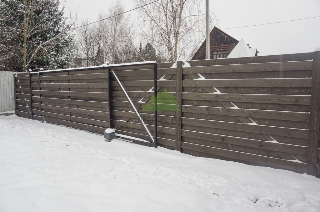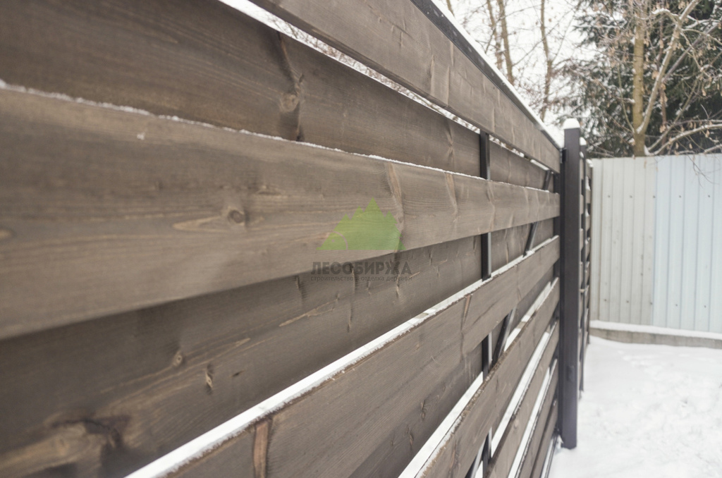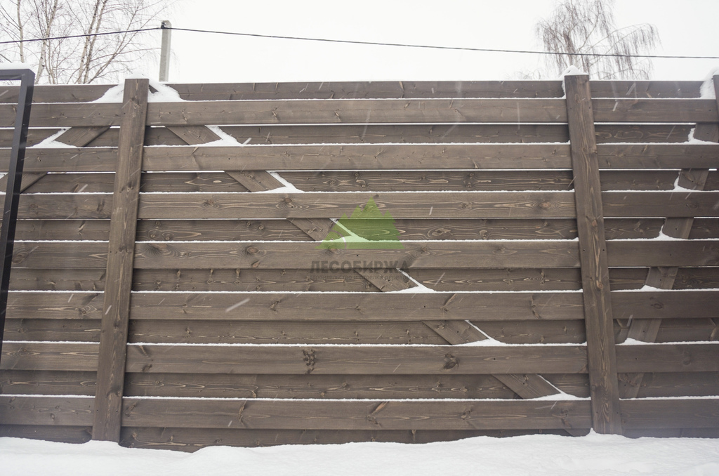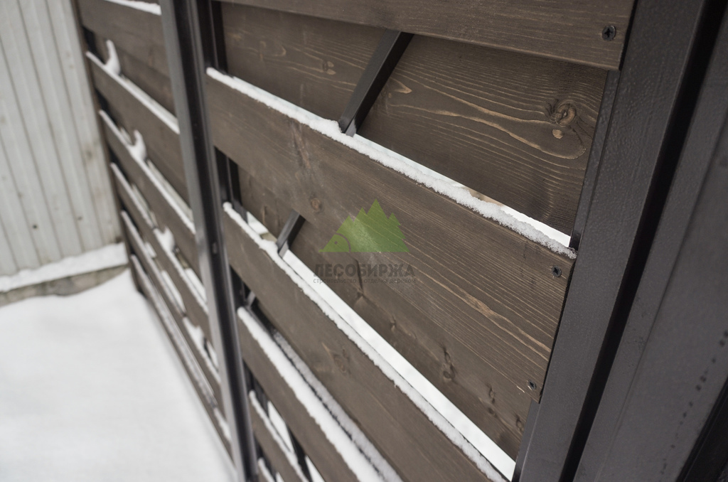 Древесина сосны, благодаря своей податливости и превосходной впитываемости покрасочных составов, позволяет создавать удивительные эстетические эффекты. Масло с добавлением колера не только защищает материал, но и выгодно подчеркивает текстуру дерева, придавая ограждению индивидуальный и изысканный вид. Дополнительно мы применили технику браширования, которая усилила визуальную привлекательность забора. Браширование — это процесс механического удаления мягких волокон древесины, что позволяет проявить и выделить естественную рельефную структуру. Этот метод придал доскам особый шарм и эксклюзивность.